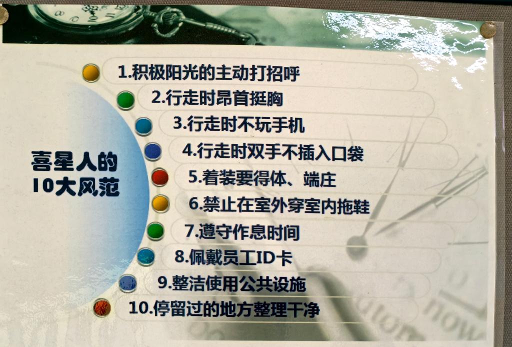 喜星人的10大风范:积极阳光的主动打招呼,行走时仰首挺胸,行走时不玩手机,行走时双手不插入口袋,着装要得体、端庄,禁止在室外穿室内拖鞋,遵守作息时间,佩戴员工ID卡,整洁使用公共设施,停留过的地方整理干净。