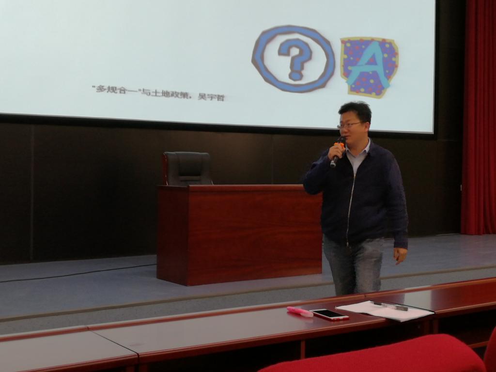 吴宇哲教授的报告共分为三个部分:首先,从1978年我国土地政策开始,系统梳理了我国土地政策几十年的变化,从这个曲折的历程我们发现土地改革的复杂性、重要性和管理的谨慎性。基于这个前提,提出了我国“国民经济社会发展规划、城乡总体规划和土地利用总体规划”三个规划合一的必要性。其次,以耕地为例,介绍了土地规划管理的两种形式,即开发式规划和控制性规划,并结合当前的经济形势和现象,不同的规划形式导致的结果,为我们深入浅出地解释了土地规划管理工作的复杂性、影响的重大性。在此基础上,提出了一个宏大的战略构想,即多规融合,他将我国“佛教、道教、儒教三教合一”的想法引申到土地规划管理领域,创新性地提出了“多规融合、多规合一”的构想。吴教授指出,虽然多规融合是一个漫长的博弈过程,但我们仍然满怀期望政府能不断提高公共政策管理水平,改变政出多门、多头管理的现象。