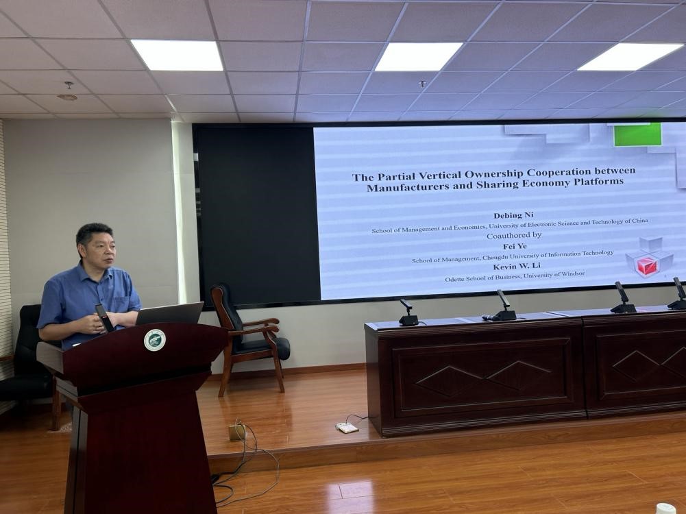 倪得兵教授汇报题目为《The Partial Vertical Ownership Cooperation between Manufacturers and Sharing Economy Platforms》。他研究了制造商、共享经济平台、零售商、消费者和整个社会的PVO合作问题,认为在合作协商支付的情况下,PVO合作水平的提高可以产生制造商、零售商、共享经济平台、消费者和社会计划者的多赢结果。
