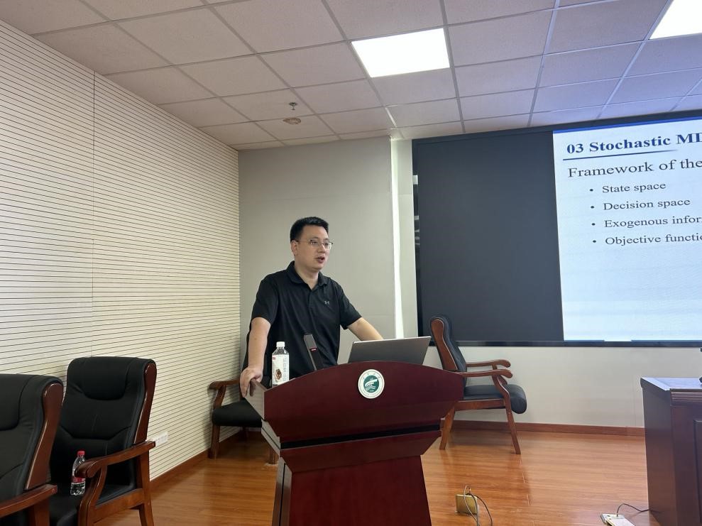 晏鹏宇教授汇报题目为《An Online RL Approach to Charging and Order-Dispatching Optimization for an E-hailing Electric Vehicle Fleet》。他的研究尝试解决随机订单下网约车平台上电动汽车的最佳充电和订单调度问题,提出了一种在线Sarsa(∆)-SAA算法,以最大限度地提高平台的收益。