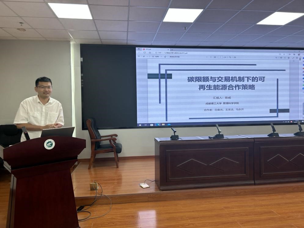 陈威研究员汇报题目为《碳限额与交易机制下的可再生能源合作策略》。他考虑了无合作、半合作和完全合作三种投资合作模式对供应链企业关键投资决策的影响,发现完全合作情形的发电商可再生能源投资量大于半合作情形下和无合作情形下,无合作情形下的售电商可再生能源投资量大于半合作情形下和完全合作情形下,且供应链整体的可再生能源投资量受可再生能源投资成本系数的影响。