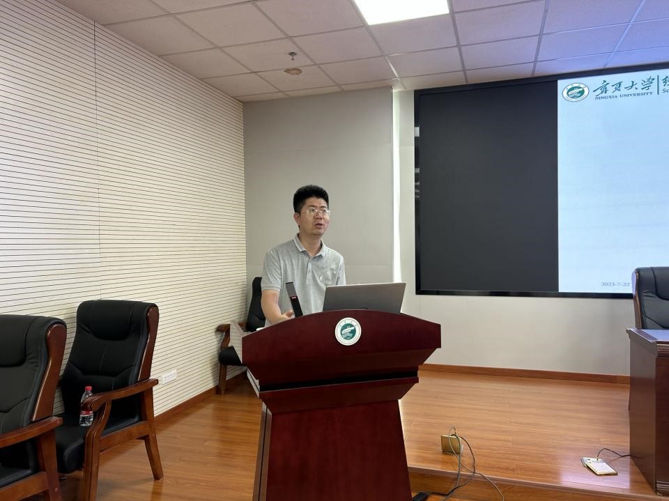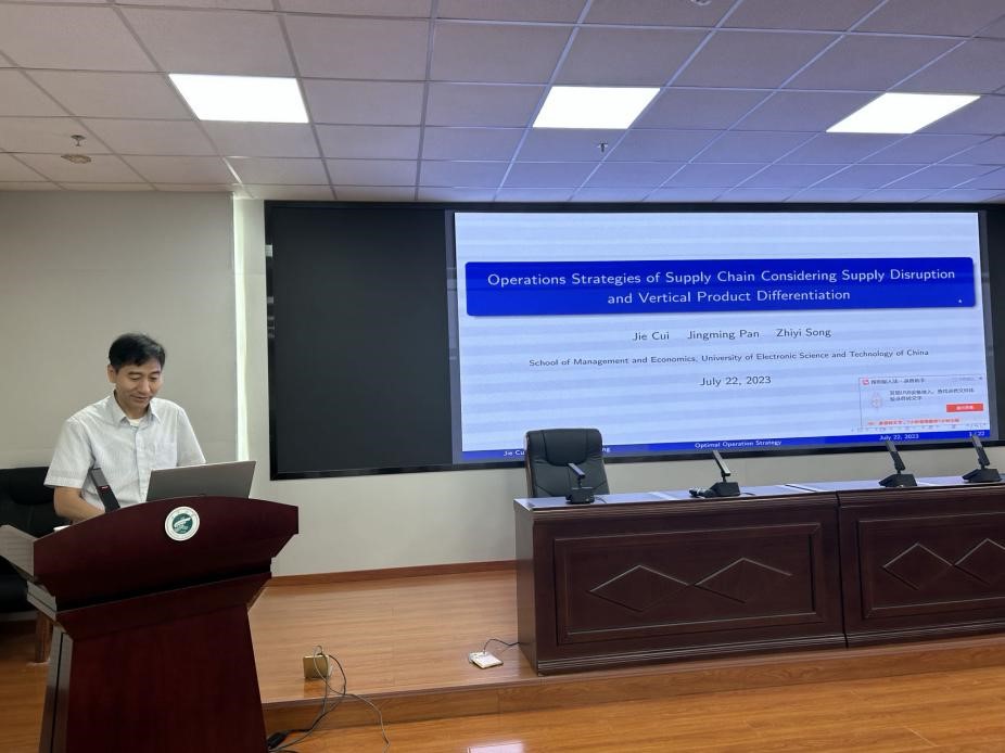 潘景铭教授汇报题目为《Operations Strategies of Supply Chain Considering Supply Disruption and Vertical Product Differentiation》。汇报从Introduction、Research Questions、Model and Equilibrium、Comparison of Sourcing Strategies、Conclusions五部分展开,针对去全球化背景下供应链的稳定性以及断供风险下企业如何构建供应链进行分析。