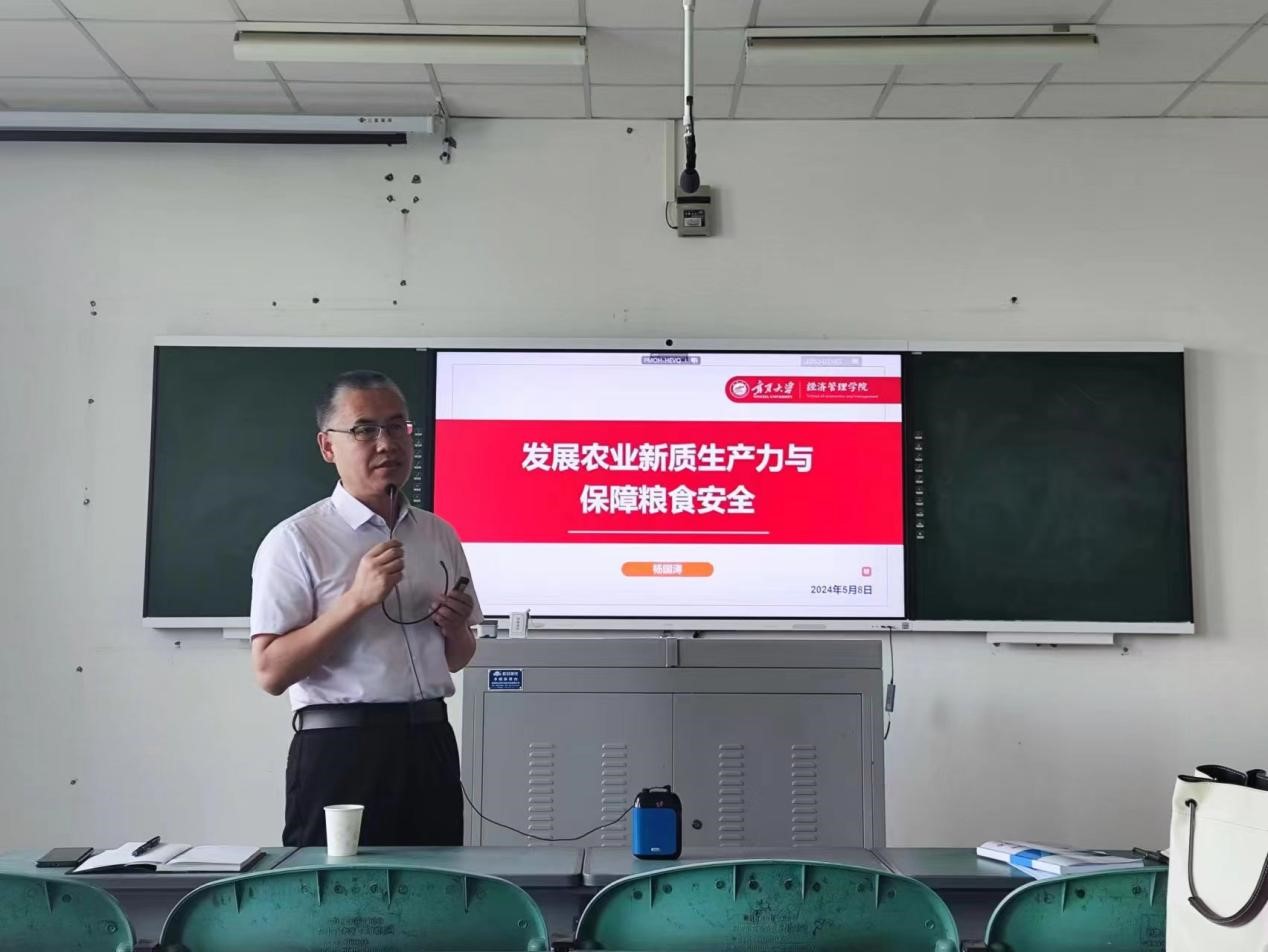 最后,杨国涛院长做了主题为“新质生产力”的党课领学,党课全程通过对于国家政策与知网中论文数量的分析,从“什么是新质生产力”和“粮食产量和粮食安全”方面进行讲解,重点强调“新质生产力就是绿色生产力”、“教育赋能新质生产力” “粮食安全”、“农业发展”等方向进行论述,鼓励青年教师进行新质生产力实证检验的研究,将科研成果转化为实际生产力,助力社会主义现代化建设。