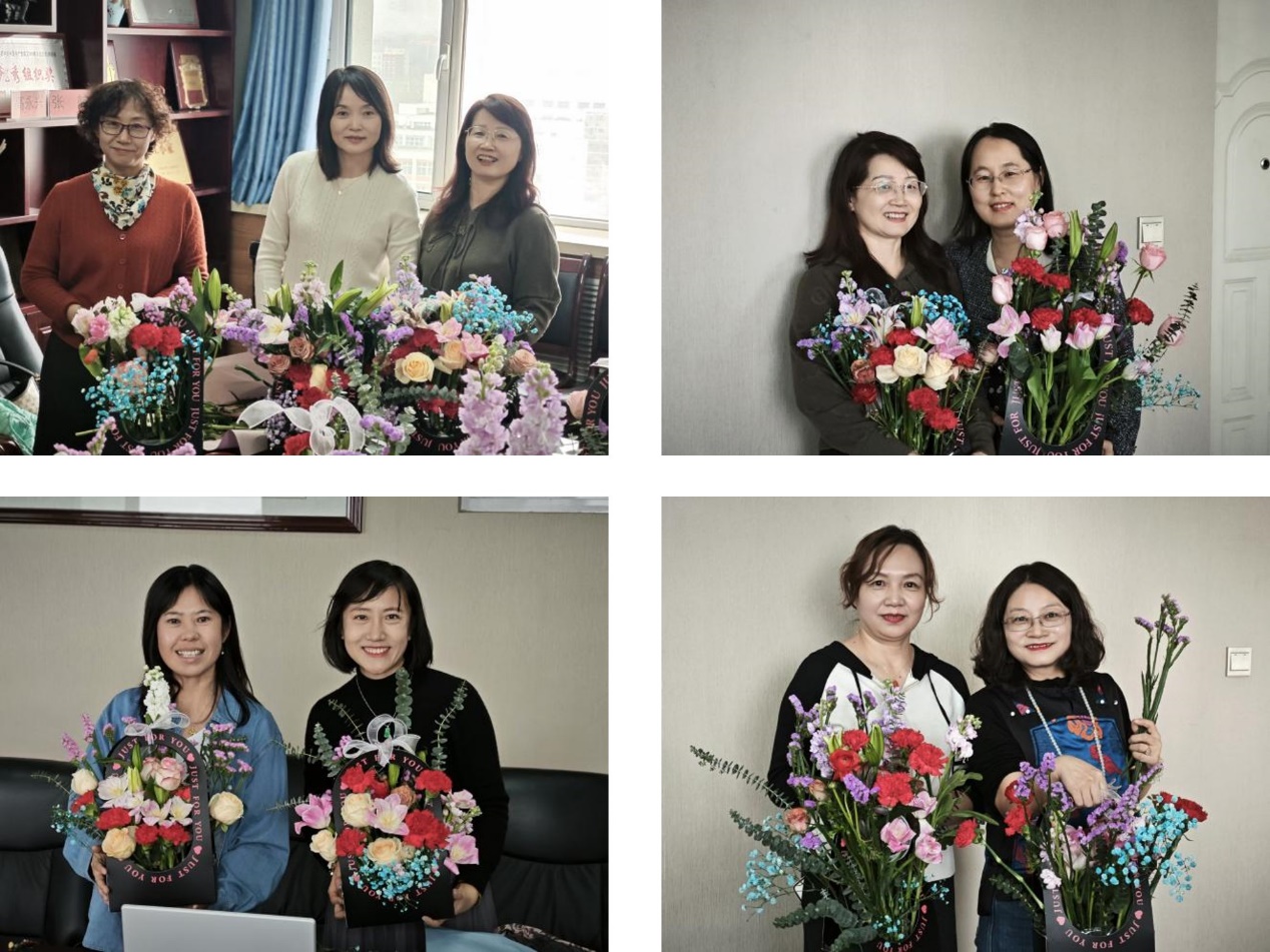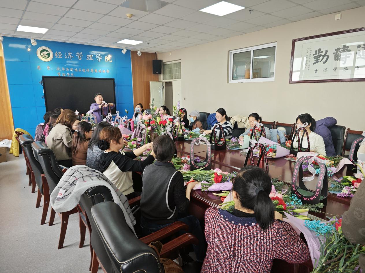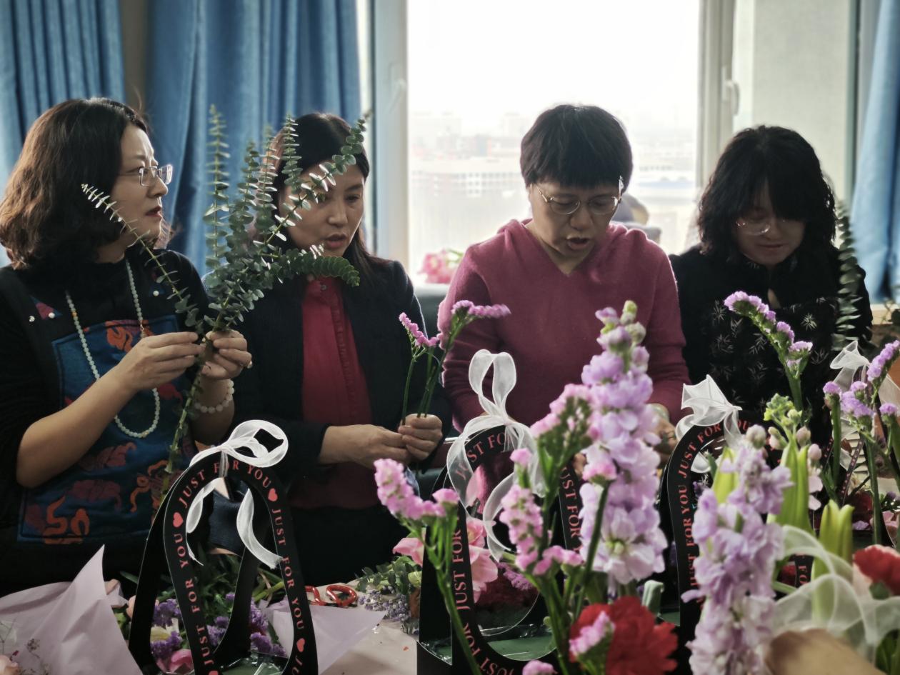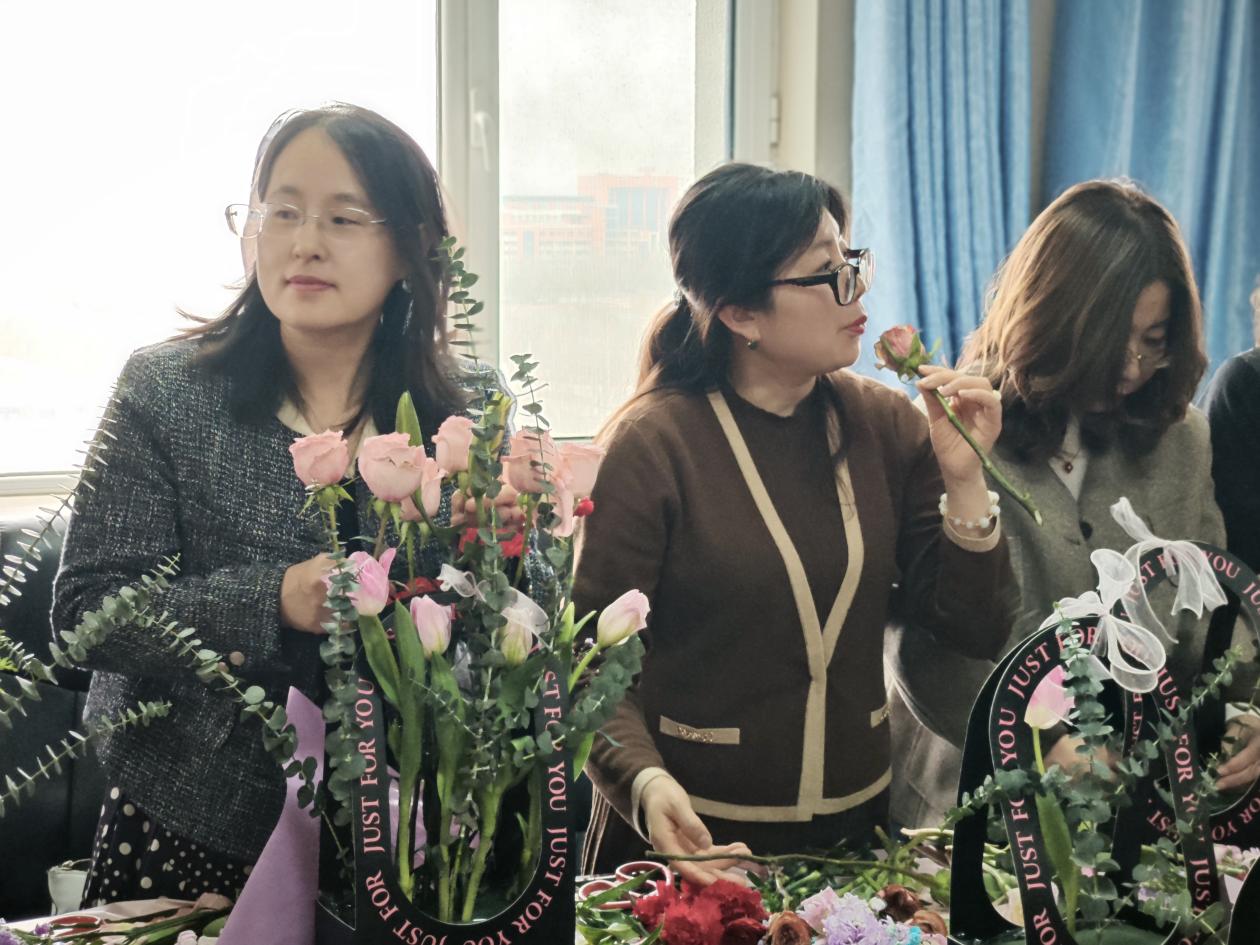 会议室温馨举行。30余位女教职工齐聚一堂,在花香四溢中感受艺术之美,共度专属节日时光。