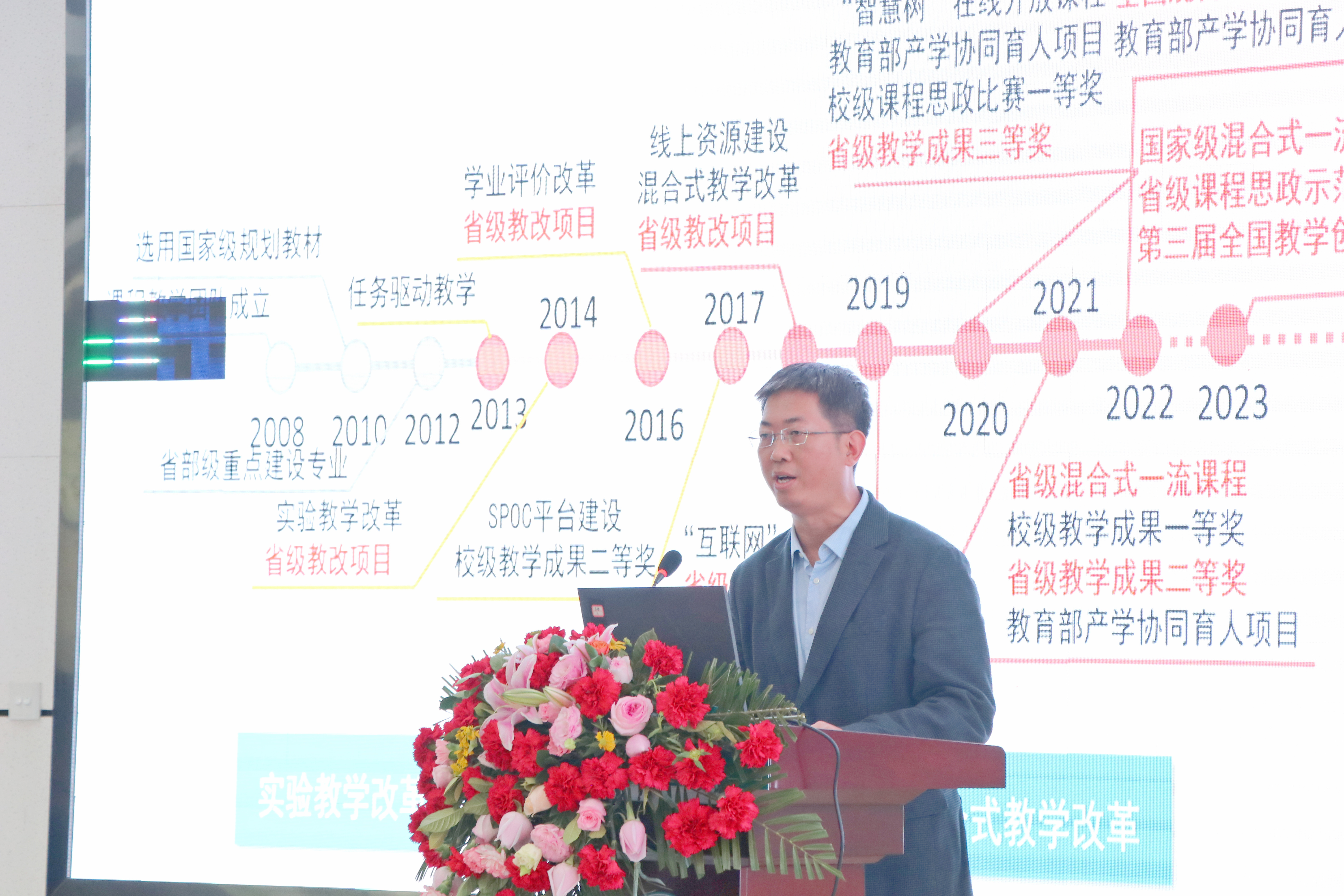 在混合式教学改革方面的探索与实践。顾教授详细介绍了课程建设历程、智慧教学环境构建、数智技术对混合式教学的支撑以及教学创新成效,为与会教师提供了宝贵的经验借鉴。