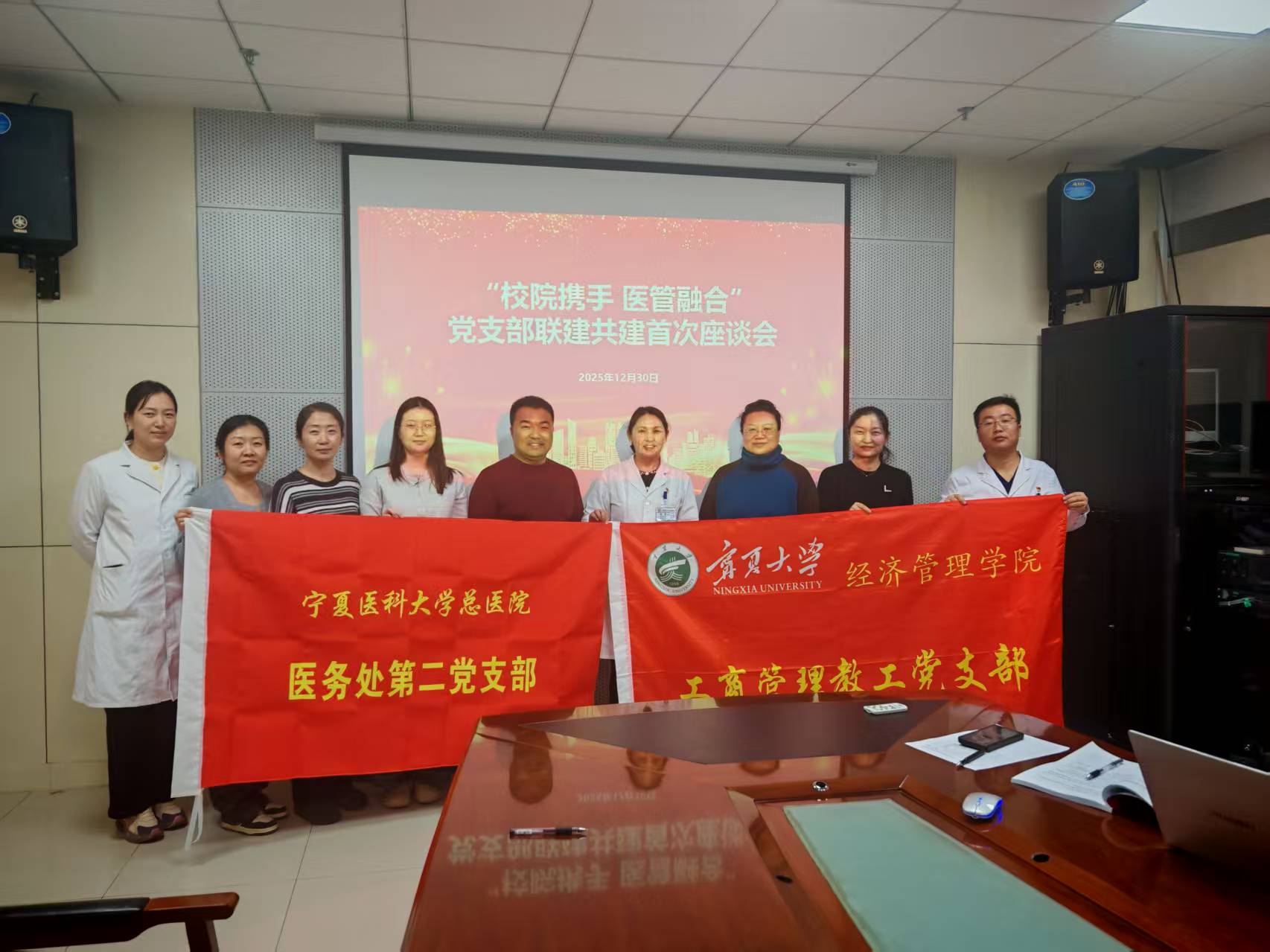 2025年12月30日,在工商管理教工党支部杨彩玲和朱丽娅两位支委带领下,“校院携手 医管融合”党支部联建共建推进会在宁夏医科大学总院科研楼二楼第四会议室举行,会议由宁医大总院医务处第二党支部书记杨霞主持,本次座谈会以“学习互鉴促提升 共建融合谋新篇”为主旨,以联建共建推动医疗实践与管理理论深度融合为目标,旨在通过资源共享、经验互鉴,实现党建与业务双提升,为工商管理学科与区域医疗健康事业融合高质量发展注入新动能。