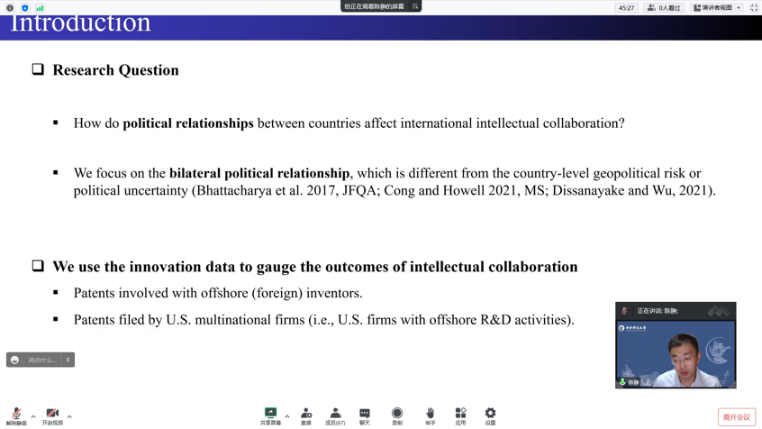 在全球国际纷争频发的大背景下,政治事件的经济影响是值得学术界关注的重要问题。陈翀教授从企业创新的角度,研究了美国与其他国家之间的政治分歧对国际知识合作的影响。文章使用专利数据来衡量知识合作,通过研究美国跨国公司的海外专利,发现美国与他国之间的政治分歧损害了美国跨国企业在离岸国家产生的专利数量和质量。陈翀教授及其团队发现国际政治冲突通过阻碍国际研究团队合作,降低海外发明者及其同事的生产力,降低发明者转移到海外公司的意愿等渠道,最终损害创新,阻碍全球技术进步。