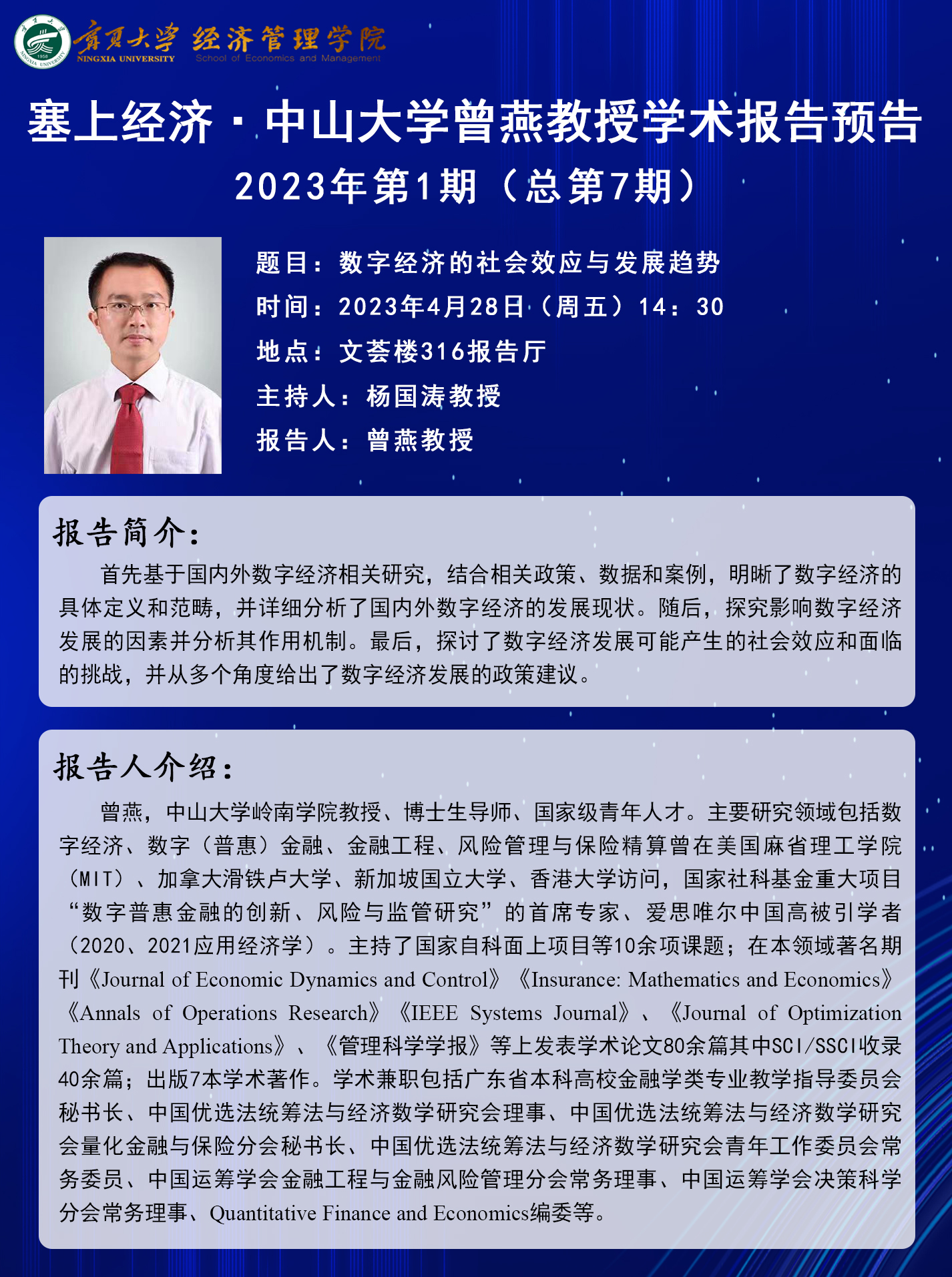 (MIT)、加拿大滑铁卢大学、新加坡国立大学、香港大学访问,国家社科基金重大项目“数字普惠金融的创新、风险与监管研究”的首席专家、爱思唯尔中国高被引学者(2020、2021应用经济学)。主持了国家自科面上项目等10余项课题;在本领域著名期刊《Journal of Economic Dynamics and Control》《Insurance: Mathematics and Economics》《Annals of Operations Research》《IEEE Systems Journal》、《Journal of Optimization Theory and Applications》、《管理科学学报》等上发表学术论文80余篇其中SCI/SSCI收录40余篇;出版7本学术著作。学术兼职包括广东省本科高校金融学类专业教学指导委员会秘书长、中国优选法统筹法与经济数学研究会理事、中国优选法统筹法与经济数学研究会量化金融与保险分会秘书长、中国优选法统筹法与经济数学研究会青年工作委员会常务委员、中国运筹学会金融工程与金融风险管理分会常务理事、中国运筹学会决策科学分会常务理事、Quantitative Finance and Economics编委等。