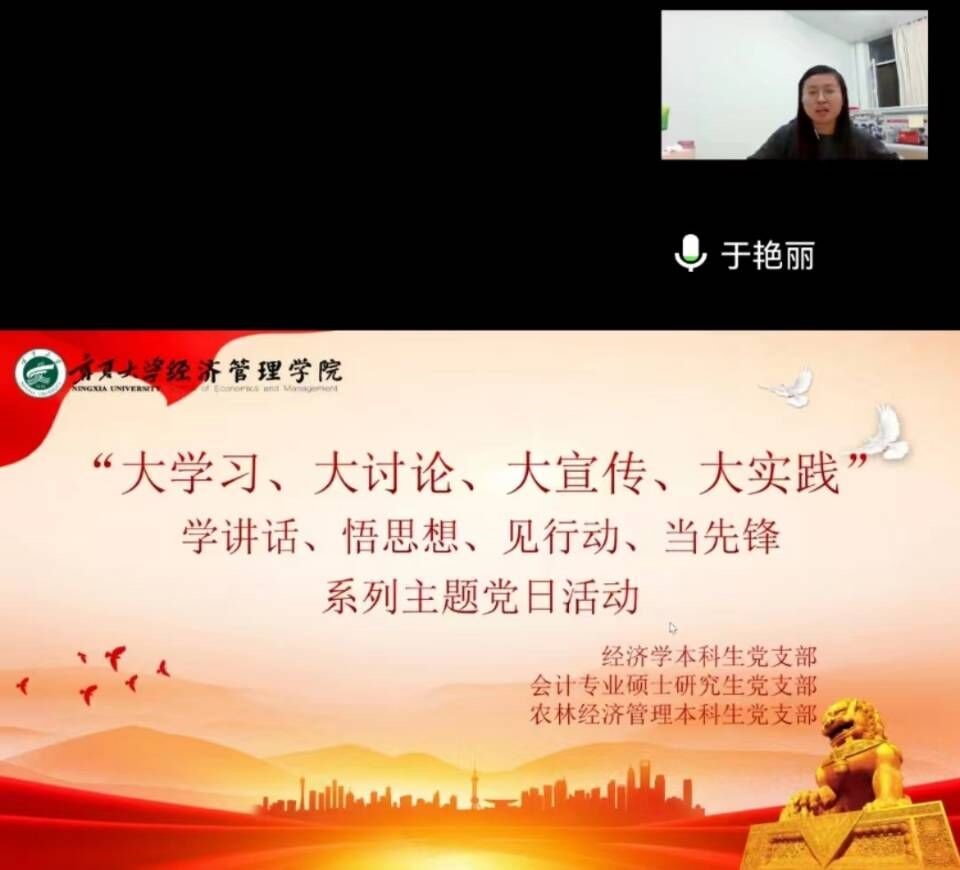 9月30日晚,赌场老虎机 “大学习、大讨论、大宣传、大实践;学讲话、悟思想、见行动、当先锋”系列主题党日活动在线上顺利举行。经济学本科生党支部、会计专业硕士党支部、农林经济管理本科生党支部参加本次会议。会议由杨艺帆主持。