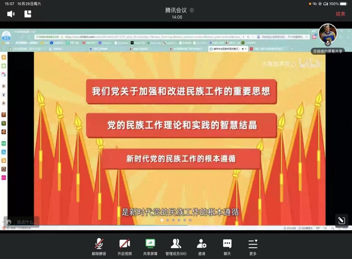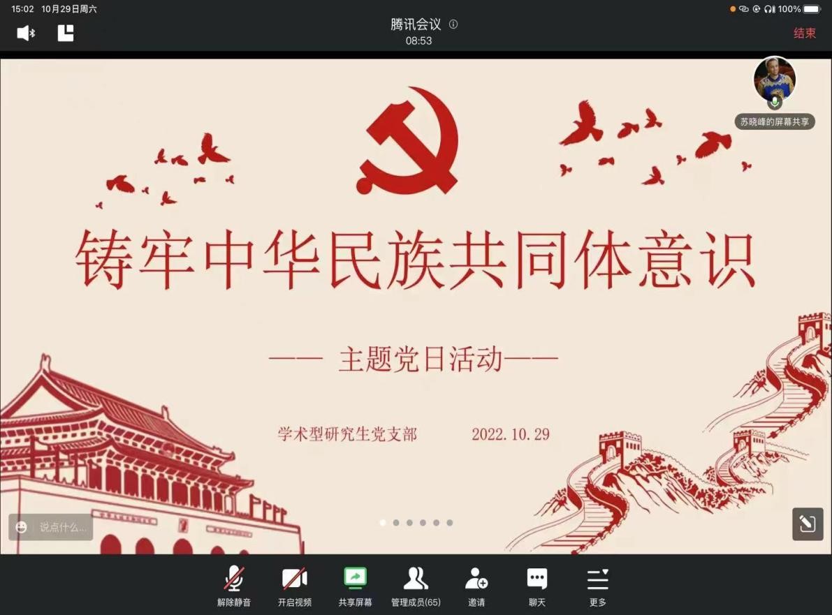 10月29日下午,赌场老虎机 学术型研究生党支部“铸牢中华民族共同体意识”主题党日活动在线上顺利召开。党支部全体党员、发展对象及积极分子参加会议,会议由党支部副书记苏晓峰主持。