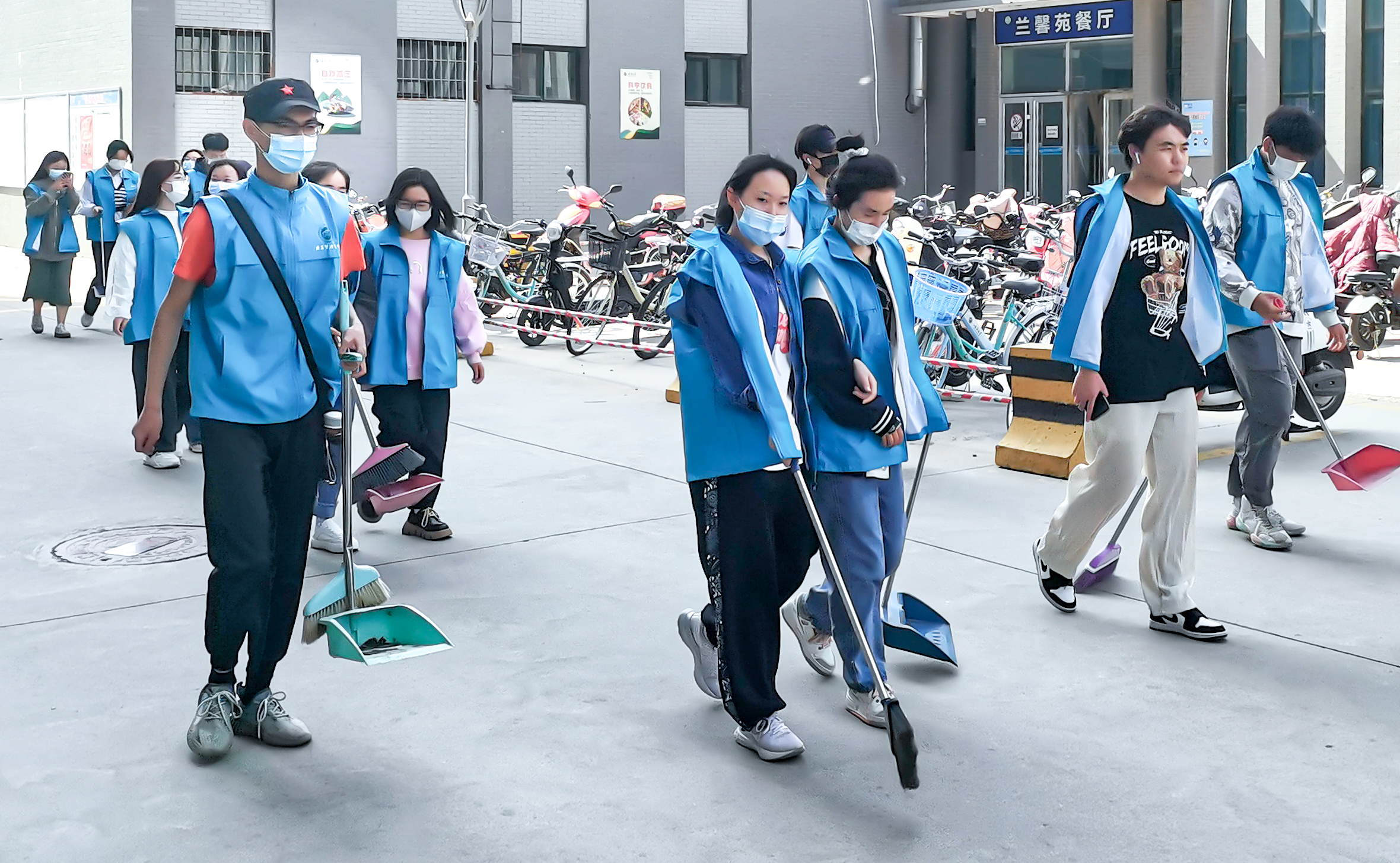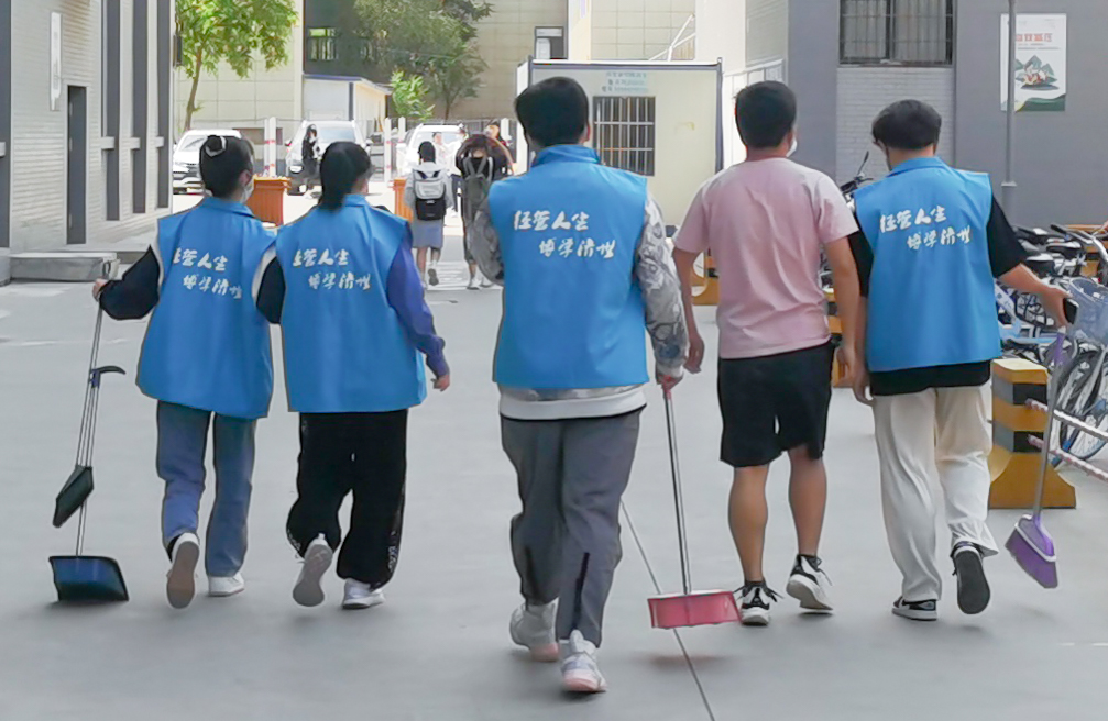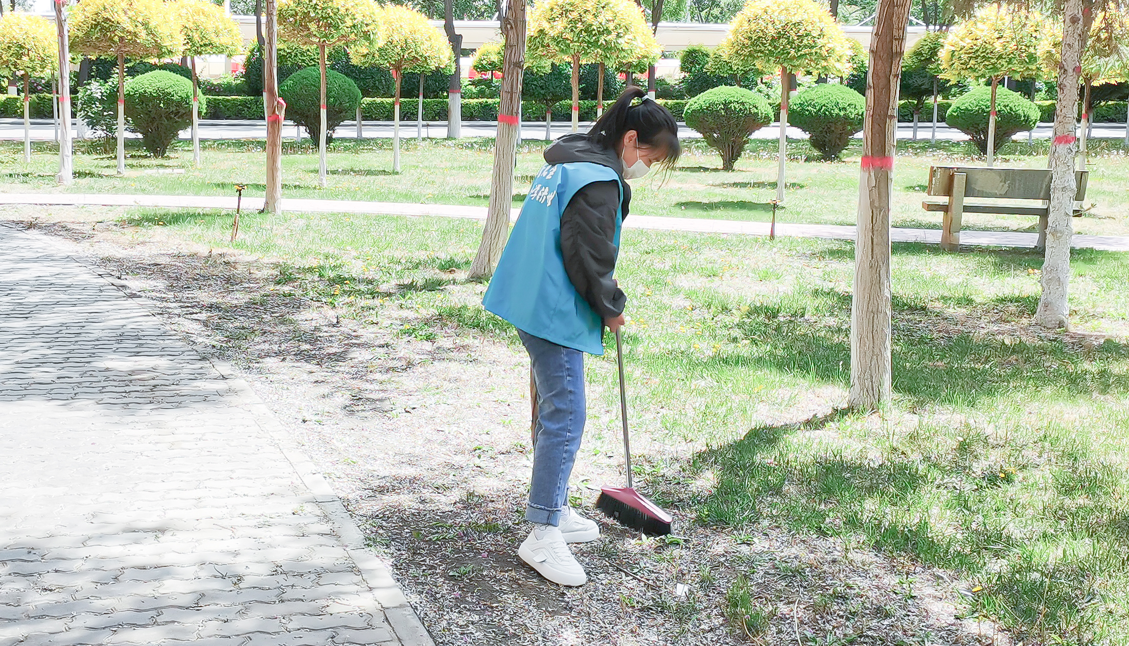 活动中,志愿者们身穿志愿服装,分工合作,认真清扫地面垃圾,并对花园死角进行彻底清理。