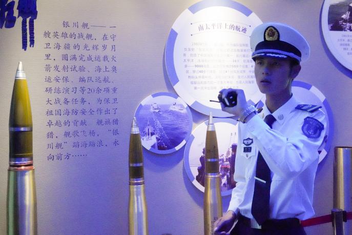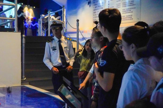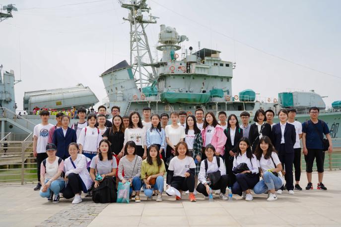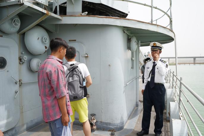 短暂车程后,同学们到达目的地,停靠在远处的银川舰显得格外庄严。众人在讲解员的带领下乘观光车到达第一站——银川舰纪念馆,馆体以海军帽与海螺为设计灵感,进门处便是中国人民保家卫国之雕塑,馆内陈列有导弹快艇模型及航载武器。讲解员生动地讲述了银川舰退役前所立战功及退役后由青岛运至银川的过程,为同学们普及了舰艇官兵编制知识,讲述着和平年代舰艇的用途。踏出馆厅,路边开阔的草坪上陈列着铁锚等舰艇零件,一行人向着国家第一代导弹驱逐舰——银川舰前行。踏上甲板,走进舱室,稍显斑驳的仪表与船头飘扬的五星红旗令同学们感受到了这服役多年的“老兵”昔日的荣光。回到广场,众人在银川舰前挥动国旗高唱《我和我的祖国》,引得行人纷纷注目合唱。