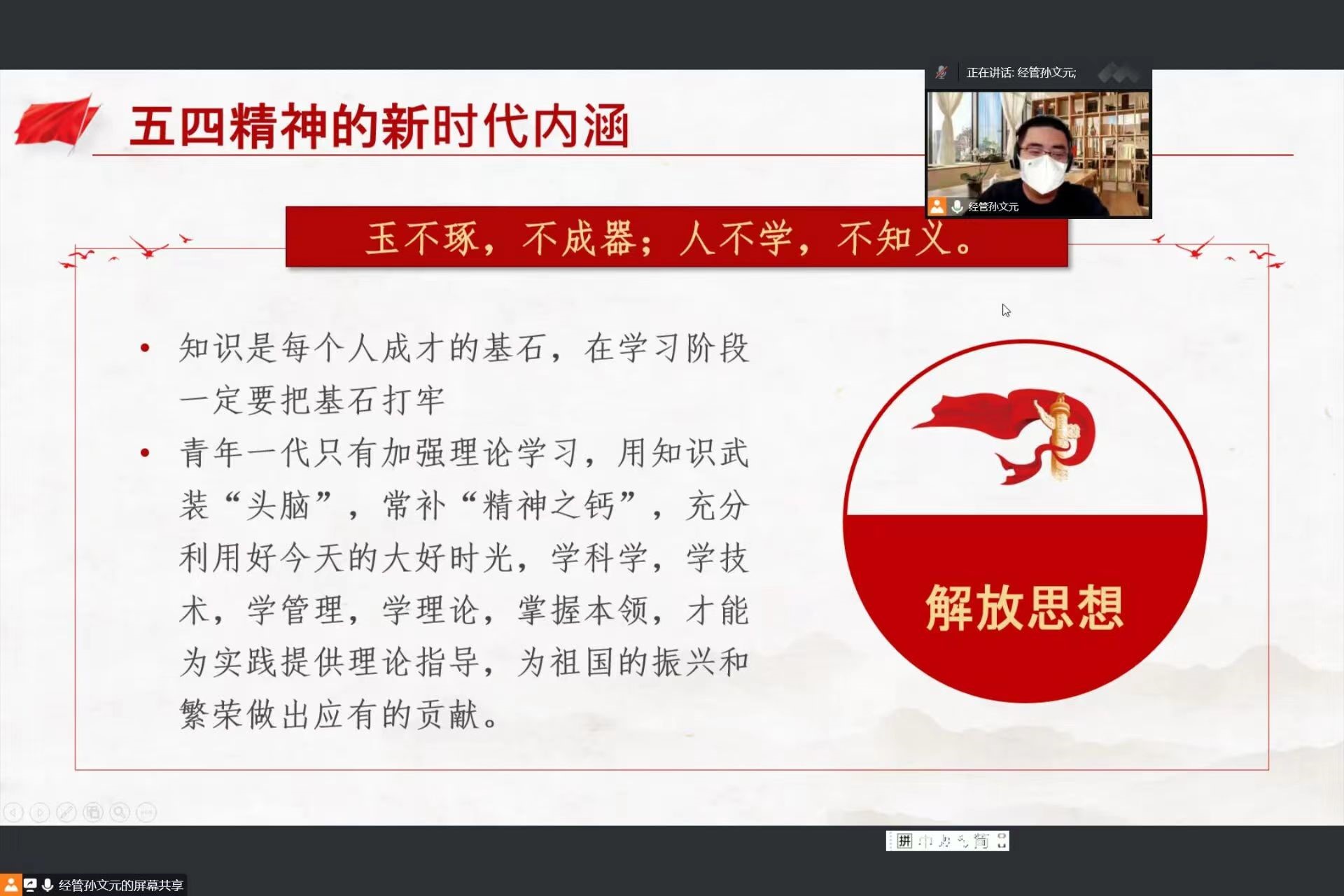 孙文元详细讲解了五四精神的核心内容及五四运动的历史意义,并结合新时代的历史方位,阐释了五四精神的新时代内涵。他谈到青年必须坚定信念、敢作敢为、不懈奋斗,以此弘扬五四精神,建功新时代。同时,基于做新时代有为青年的思想内容,孙文元对同学们提出了方向要明、品格要高、干劲要足的三点要求,并希望学员们严于律己、锤炼品格,以饱满的热情努力学习、积极实践、不负韶华。