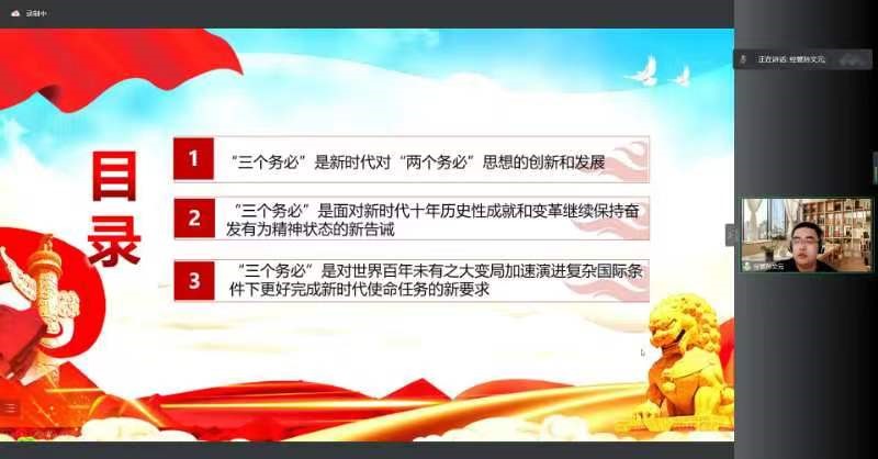 孙文元从三个方面介绍了深刻认识和把握“三个务必”的重大历史意义,他讲到“三个务必”是新时代对“两个务必”思想的创新和发展;是面对新时代十年历史性成就和变革继续保持奋发有为精神状态的新告诫;是对世界百年未有之大变局加速演进复杂国际条件下更好完成新时代使命任务的新要求。孙文元希望全体学生干部积极向党组织靠拢,务必不忘初心、牢记使命,要想同学之所想、急同学之所急,勇于担当,敢于作为,发挥好带头作用。务必谦虚谨慎、艰苦奋斗,增强责任感、使命感,以坚定的决心、顽强的意志推进赌场老虎机 各项工作落实落深落地。务必敢于斗争、善于斗争,在疫情防控期间,要遵守赌场老虎机 要求,积极克服困难,不信谣,不传谣,奏响敢于斗争、善于斗争的青春合鸣。
